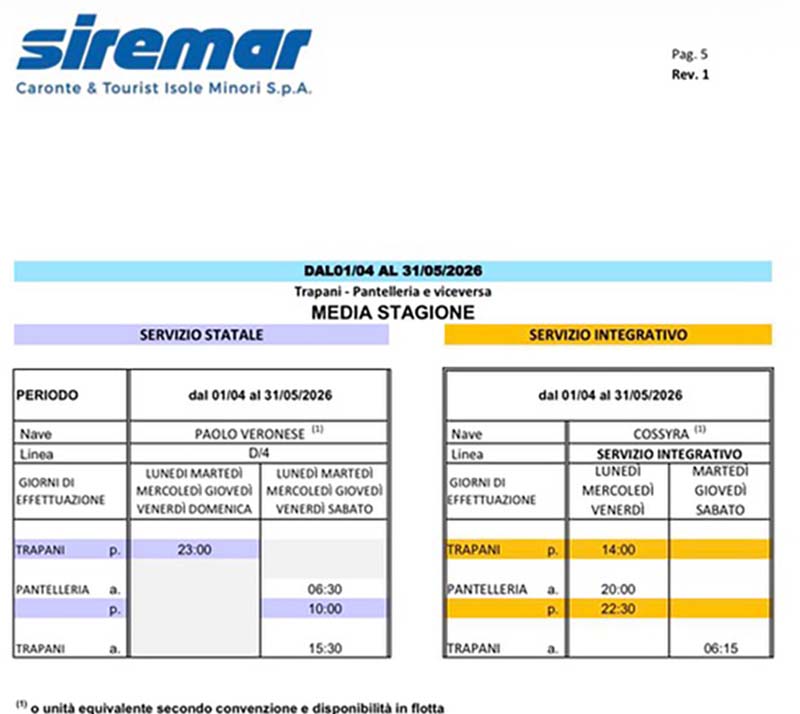 e da Pantelleria, in vigore dal primo aprile al 31 maggio 2026.